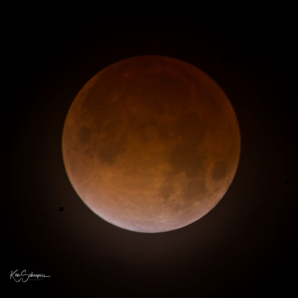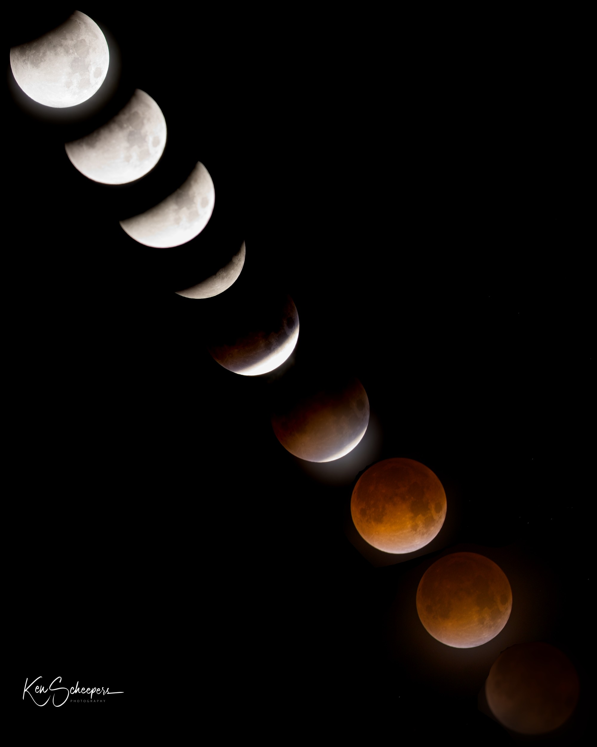 Waking up at 2 am, a 200 yard walk to my foreground mountain to set up the tripods, star trackers and cameras. My first shot was at 2:45 am with a few scattered clouds. Taking an image every 5-7 minutes at 560 mm focal length, I was able to capture clear images up until totality which is when the clouds rolled through, blocking and further images. The photo below is a 20 x 30 composition of the actual image size.